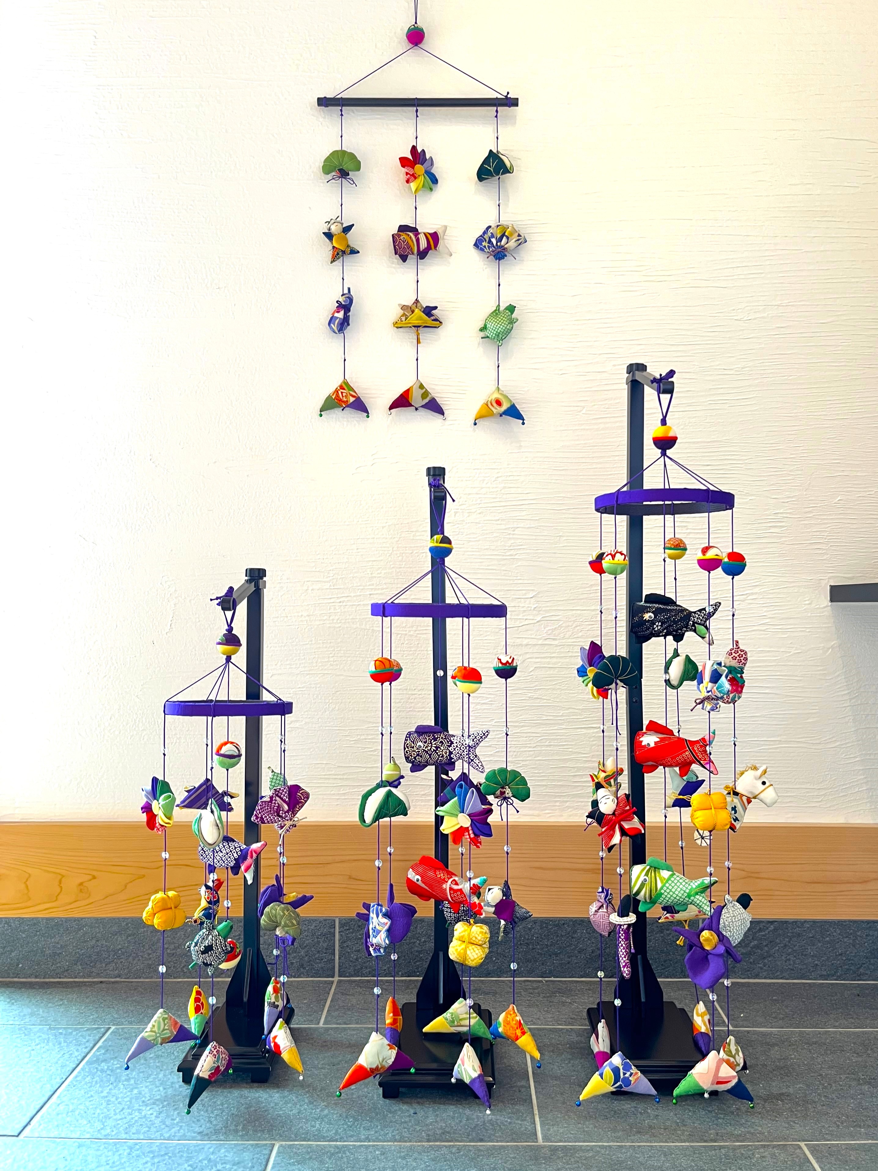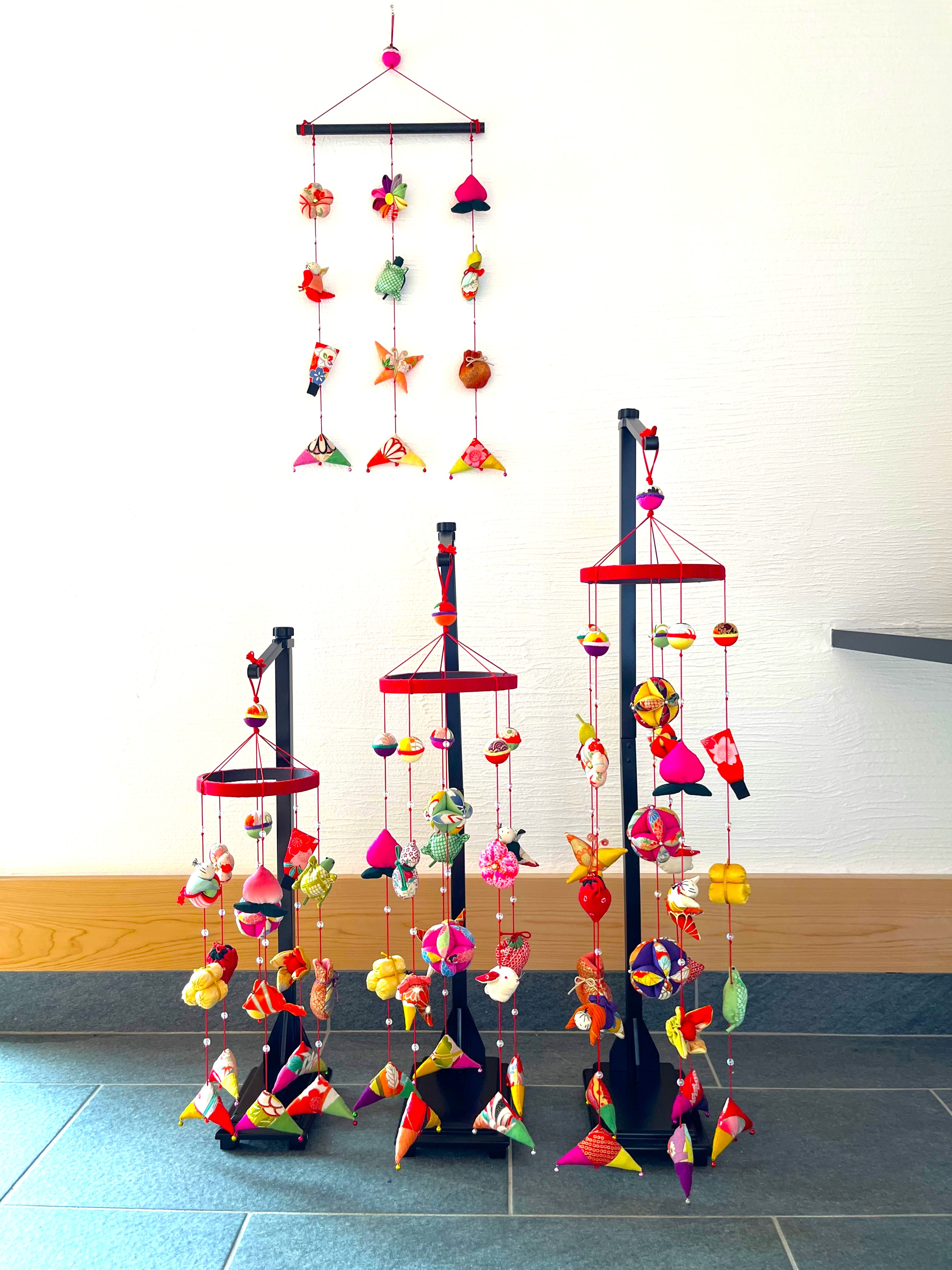 ■オーダーメイドでできること 【つるし雛・つるし飾り】 ・サイズの変更(長さ・幅・つるし紐の本数など) ・小物の変更(種類・数の変更。 サイト内でご紹介している小物であれば制作可能です。 お花を多くして欲しい、この小物とこの小物を交換して欲しいなど) ・色や雰囲気の指定(赤系でまとめて欲しい、シックに、可愛らしくなど)